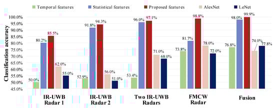 The comparison results on each radar and multi-radar fusion with the five methods are illustrated in Figure 8. The proposed features present the best performance among all of these methods on both IR-UWB and FMCW radars as well as their combinations. The classification accuracies on each single radar all exceed 85.5% with the proposed features, and are clearly better than those of the other four methods. Results prove the robustness and superiority of the proposed features on different radars and for data fusion. In addition, it is observed that the accuracies of all three feature-based methods present improvements with feature fusion compared with that of each radar, demonstrating the effectiveness of radar information fusion.