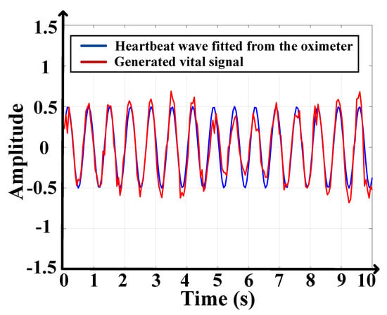 In the experiments on vital sign monitoring, 80% of the radar data is randomly chosen to train A-FuseNet, and the other 20% is utilized for testing. Figure 9 indicates a fused vital sign signal generated by A-FuseNet and a reference of the synchronous waveform. The red line represents the generated heartbeat signal with 10 s, while the blue line is the sinusoidal waveform fitted with the heartbeat frequency recorded by the oximeter synchronously. As illustrated, the waveform profile of the generated signal effectively fits with the reference, proving the reliability of A-FuseNet for generating vital sign signals. It is observed that there exists a partial deformation in the amplitude of the generated signal, but the frequency is perfectly matched with that of the reference. Since that FFT is applied on the generated signal to estimate heartbeat rate in this paper, it is acceptable with the deviation of amplitudes. In the future, the synchronous ECG signal could be utilized as the reference to optimize A-FuseNet, and it is possible to obtain a more informative heartbeat waveform with PQRST characteristics. PQRST denotes the P, Q, R, S and T waves, indicating the turning points of a heartbeat waveform in the ECG signal, of which the amplitude and duration describe more detailed information about cardiac movement.