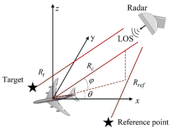 The 3-D radar imaging geometry of the general spotlight mode is shown in Figure 1. The imaging geometry could be equivalent to the circular SAR and turntable ISAR with a few modifications []. First, it is assumed that there is an ideal point target and a reference point target in the imaging scene. Then, the azimuth angle and the elevation angle with the z-axis denote the radar illumination. and denote the range of the ideal point target and reference point away from the radar, respectively. The echo of point target can be described as
