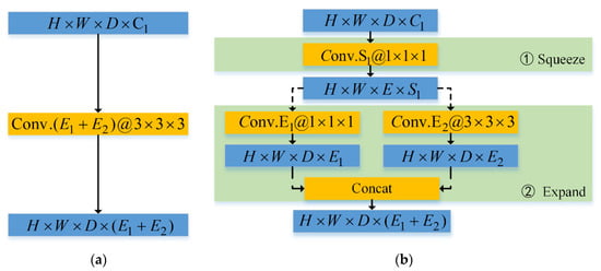 For lightweight CNN, computational cost and model depth are the two most important factors to be considered. The computational cost mainly concerns the number of network parameters and floating-point operations per second (FLOPs). The number of network parameters in traditional direction connection of convolution layers is enormous in the case of 3-D convolution. Due to the fact that the channel features in high dimension space are redundant, channel compression is an important way to reduce the number of network parameters. Inspired by [], Figure 2 shows the direct connection of convolution layers and the designed convolution ‘Fire’ module. The mathematical formulas on the blue box and orange box represent the feature of corresponding size and convolution layers with specific kernel size, respectively. For example, denotes the height, width, depth, and channel numbers of four-dimension tensor, respectively. denotes convolution layer of kernel size and channel number .