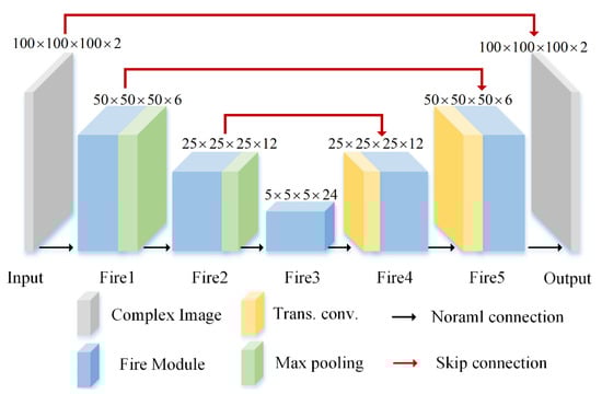 The whole network structure of SR-CNN is constructed as an end-to-end framework with supervised training. The specific structure adopts on the modified structure of full CNN [], which can yield high performance with few training data set. The detailed network structure is shown in Figure 3. First, for the input and output of SR-CNN, we treat complex data as dual-channel data, which represents real and imaginary part, respectively, rather than amplitude and phase. It is because experiments have found that the latter is difficult to converge. We guess that the feature of amplitude and phase channel is huge and far from an image in conventional sense, which lead the convolution layer hardly to extract effective features. Then, the main difference between original full CNN and our modified structure is that the original direct connections of convolution layers are replaced by the ‘Fire’ module. In addition, the stride sizes of max pooling layers are 2 and 5 in turn, while the sizes of corresponding transpose convolution (Trans. conv) layers are reversed. Moreover, these features are concatenated in channel dimension by skip connection. The detailed size of each layer output is displayed on the top of the cubes. According to these sizes and conditions that the ‘Fire’ module needs to meet, it is easy to calculate the size of parameters and .