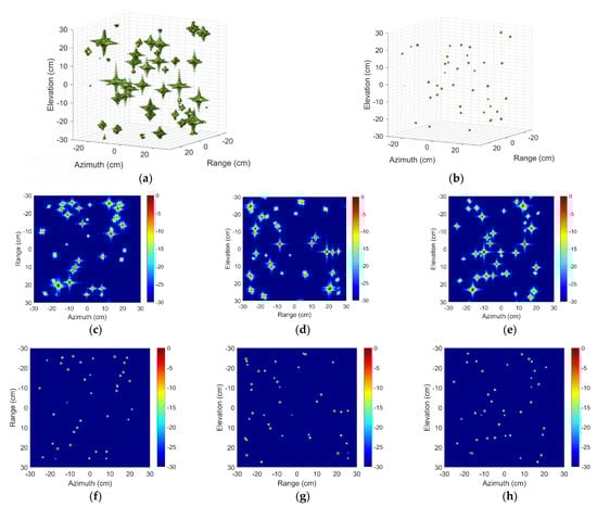 The inputs and outputs of SR-CNN are generated, respectively, through (8) and (10). The imaging parameters are set as following: frequency ranges from 213.6 GHz to 226.4 GHz with 51 evenly sampling points, azimuth angle, and elevation angle both ranging from −1.68° to 1.68° with evenly 51 sampling points. It means that . As shown, . According to (9), it is easy to calculate the resolutions in range, azimuth and elevation dimensions are 1.17 cm, 1.15 cm and 1.15 cm, respectively. For the expected SR output, , , and are set as 0.4 cm. According to (11), the resolutions in all three dimensions can be calculated as 0.47 cm, so the expected SR ratio is about 2.5 times in three directions.