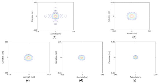 To compare the difference between BPDN and SR-CNN intuitively, the contours images are chosen, which can reflect the side-lobe and fined contour structure. Figure 6 displays the azimuth–elevation contour images at range 0 m. The analysis of Figure 6a,b is consistent with the above and will not be repeated here. Comparing with Figure 6c,d, it can be found that BPDN achieves side-lobe suppression, but the contour is relatively more uneven than SR-CNN. The main reason may be that the optimization principle of BPDN is based on L1 regularization, where the stop conditions usually are met in the coordinate axes direction. In addition, since the expected output of SR-CNN owns smooth edges, the final prediction results of SR-CNN in supervised training do not exist in this problem. We also note that the prediction by SR-CNN is not completely consistent with the ground-truth, which means that SR ratio does not actually reach 2.5.