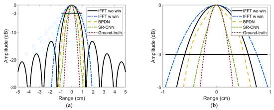 To further measure the performance of SR ratio directly, high resolution range profile (HRRP) is selected to compare −3 dB width. Figure 7 shows the HRRP at azimuth 0m and elevation 0 m. Observing the −3 dB line of the local amplification image in Figure 7b, the widths of main lobe are among these five range profiles are about 1.17 cm, 1.50 cm, 0.98 cm, 0.6 cm, and 0.47 cm, in turn. These numerical are consistent with the theoretical analysis. It can be calculated easily that adding window suffers from about 1.28 times main-lobe widening. BPDN reaches about 1.2 times SR while SR-CNN achieves 2 times. Furthermore, the EXP1 in Table 1 compares the time needs for four methods. Due to the speedup of GPU parallel and lightweight network, SR-CNN just needs less than 1 s while BPDN needs more than 130 s. This is because once the network model has already trained, the prediction process just depends on a simple forward convolution process rather than iterative optimization.