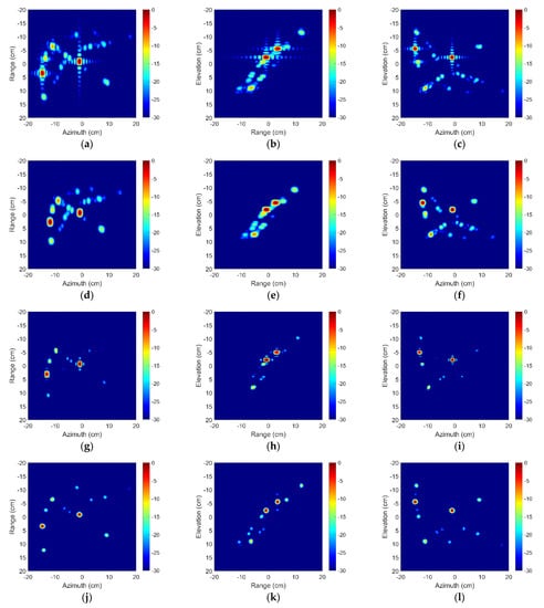 Two-dimension image profiles of aircraft A380 by (a–c) 3-D IFFT without windowing, (d–f) 3-D IFFT with windowing, (g–i) BPDN, (j–l) SR-CNN. First column is the range–azimuth profile. Second column is the range–elevation profile. The last column is the azimuth–elevation profile.