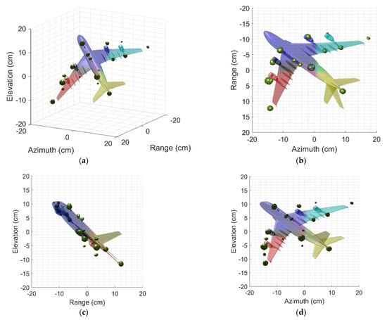Three-dimension Images profiled on the CAD model. (a) Three-dimension image. (b) Range–azimuth profile. (c) Range–elevation profile. (d) Azimuth–elevation profile.