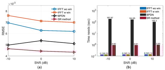 With the anti-noise ability and time needs for sparsity estimation, BPDN and SR-CNN are compared. The signal-noise-ratio (SNR) chooses −10, 0, and 10 dB. It is worth noting that 100 independent repeated tests are carried out for each SNR and each method. The root mean square error (RMSE) is used as a quantitative performance index to evaluate the accuracy. It is defined as follows: