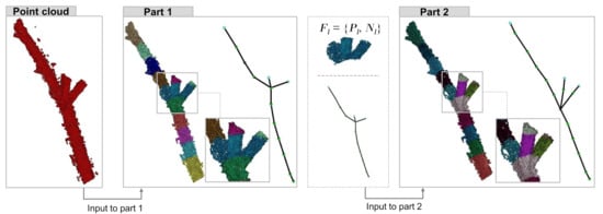 Thus, the second part of our method refines the skeleton geometry around each fork, using as input the points and normal vectors associated with each fork (Figure 1 (Part 2)). If normals are unavailable, existing methods for normal estimation [,] can be applied before using our method.