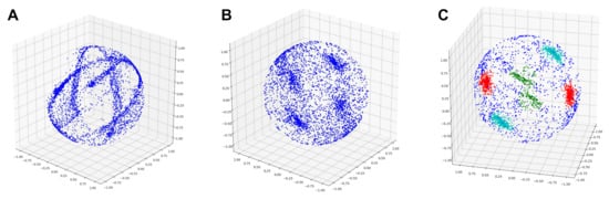 Figure 3C shows the results of our sampling method, which reduces noise. There are six clusters corresponding to the three rings, because the sign of the cross product depends on the order of operation; thus, we generally expect two opposite vectors for each ring.