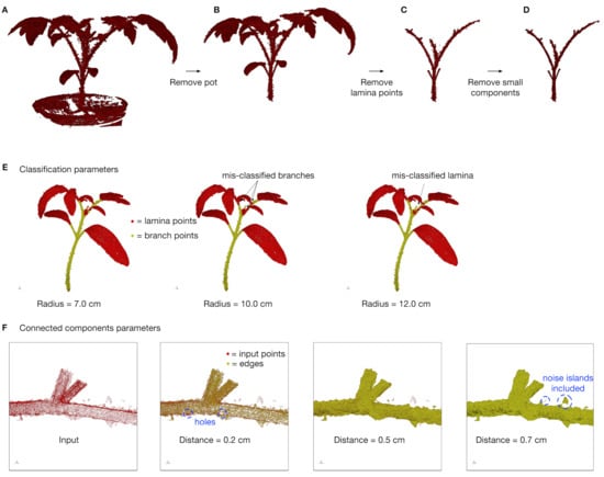 Pre-processing steps. (A) The raw input point cloud after scanning. (B) The point cloud after manually removing the pot. (C) The point cloud after removing lamina points with deep learning classification []. (D) The final set of branch points after removing small connected components. (E) The effect of the radius parameter on classification performance. The radius parameter is used to compute fast point feature histograms [], which are used as feature vectors for classification. (F) The effect of the distance parameter on the connected components algorithm. The distance parameter is used to identify and remove isolated islands of points prior to applying our skeletonization algorithm.