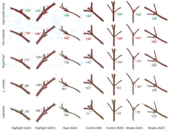 As plant shapes vary across species and are highly plastic to environmental changes, we tested our method on a dataset of two species (tomato and tobacco) grown under five conditions (ambient light, shade, high-heat, high-light, and drought), and scanned at multiple developmental time points, to assess the ability of our method to handle natural variability. Compared to three existing skeletonization methods (Laplacian-based contraction [], -medial skeletonization [], and PypeTree []), the branch angles we generated were, on average, 1.71 to 2.69 times (in absolute error) and 1.61 to 2.48 times (in percent error) more accurate. Finally, our method runs in seconds, making it amenable to real-time phenotyping applications.