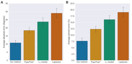 Importantly, our method demonstrated similar gains when tested on forks from tobacco plants. Over 13 forks from four tobacco plants across two conditions, in terms of absolute errors, our method was on average 1.39-times more accurate than PypeTree*; 2.13-times more accurate than ; and 2.16-times more accurate than Laplacian. In terms of percent errors, our method was on average 1.26-times more accurate than PypeTree*; 1.99-times more accurate than -medial; and 1.99-times more accurate than Laplacian. Thus, our method was able to generalize well across two species.