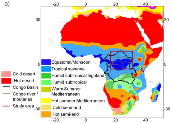 The Congo River Basin (Figure 1a) is the largest drainage basin in Africa. Its shape is almost circular, covering an area of ~4 million km2 [42]. It is the second river in the world, after the Amazon River, in terms of discharge (~40,000 m3·s−1) [43]. Its main waterway is the Congo River, with a length of ~6650 km from its source in the southeast of the Democratic Republic of Congo to the Atlantic Ocean [44]. The Congo River Basin is mainly located in the equatorial and tropical savanna climate area according to the Köppen–Geiger climate classification [45], but also in the humid subtropical climate in its southern part, and, marginally, in the semi-arid and desert climates in the east (Figure 1a).