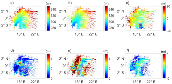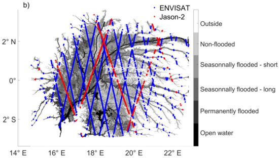 Data acquired by two altimetry missions (ENVISAT and Jason-2) were considered in this study. These two missions were operating on their nominal orbits from March 2002 to October 2010 and from June 2008 to September 2016 respectively. These two missions were chosen because they were operating when PALSAR-1 onboard ALOS-1 was in operation (see Section 3.2). A complete description of these two altimetry missions can be found in [58] and in [59]. In this study, the following parameters, available at high frequency (i.e., at 18 Hz for ENVISAT and 20 Hz for Jason-2, that is to say ~350 m along the altimetry ground-tracks), were used: the time and geographical locations of acquisition, the distance between the satellite and the surface or range, the orbit of the satellite, the corrections applied to the range to account for the delays caused by the path through the atmosphere (ionosphere, dry and wet atmosphere corrections) and some geophysical effects (solid earth and pole tides), the geoid model and the backscattering coefficient (σ0) at Ku-band. Radar altimeter ranges and backscattering coefficients at Ku-band are derived from the offset center of gravity (OCOG) retracking algorithm [60], found to be well-suited for land surface studies in several previous studies (e.g., [26,61]). All these parameters, contained in the geophysical data records (GDR) of each mission, are made available by Centre de Topographie des Océans et de l’Hydrosphère (CTOH) [62], as well as indexes of the normalized tracks [63,64] that were used to compute statistics along the tracks (see Section 4.2). The location of the ground-tracks in the Cuvette Centrale is presented in Figure 1b.
