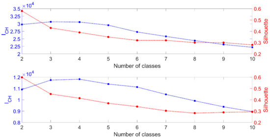 Evolution of the Calinski–Harabasz criterion (ICH in blue) and the silhouette (in red) criterion as a function of the number of classes for ENVISAT (upper panel); Jason-2 (lower panel) backscattering coefficients.
