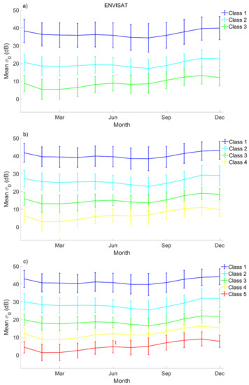Seasonal variations in the mean backscattering coefficient and its associated deviation at Ku-band from ENVISAT (2003–2010) for each class when considering (a) 3, (b) 4, (c) 5 classes.