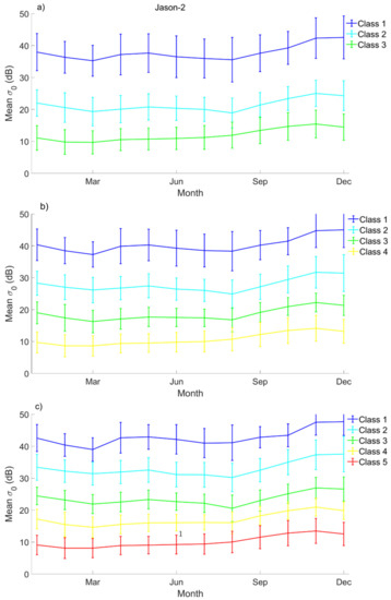 Seasonal variations in the mean backscattering coefficient and its associated deviation at Ku-band from Jason-2 (2008–2016) for each class when considering (a) 3, (b) 4, (c) 5 classes.