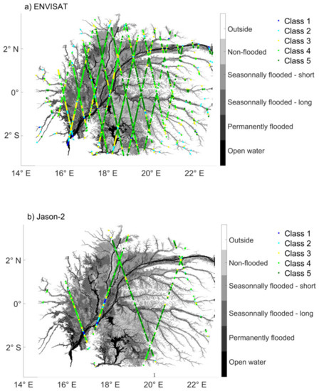 The spatial distribution of the backscattering classes is presented for ENVISAT and Jason-2 over the whole Cuvette Centrale in Figure 5 and a smaller area in Figure 6 to illustrate the good agreement between the unsupervised classification and the land types.
