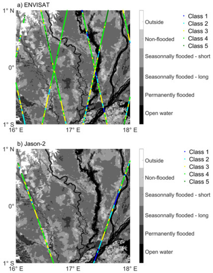 Spatial distribution of the backscattering classes (Ku band) from (a) ENVISAT and (b) Jason-2 in the Cuvette Centrale of Congo.
