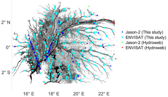 As no in situ data of water stage are available in the study area during the altimetry period, time series of water levels derived from ENVISAT and Jason-2 data over rivers in the Cuvette Centrale were used to validate the automatic estimates of river heights derived from the unsupervised classification applied to the radar altimetry backscattering coefficients. They were obtained from the Hydroweb database [41]. In this study, 24 and 32 time series from ENVISAT (35-day repeat period) and Jason-2 (10-day repeat period), respectively, were used. The length of the cross-sections between the river and the altimetry tracks range from 100 to 150 m in the upstream parts of the Cuvette Centrale to 10 km in its downstream part.