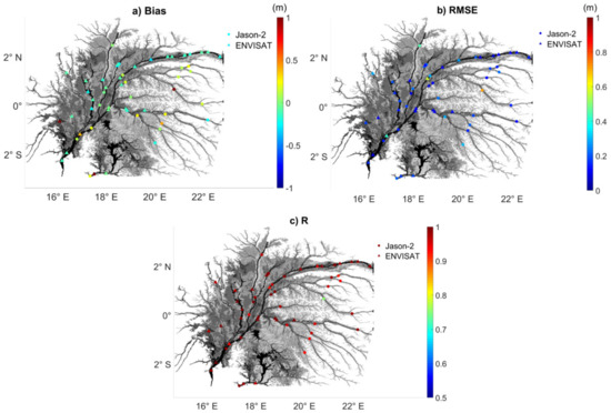 Comparison between altimetry-based of water levels from Hydroweb and automatically generated (this study) in terms of (a) bias, (b) RMSE and (c) r. VS locations are represented using either a dot (Jason-2) or a triangle (ENVISAT).