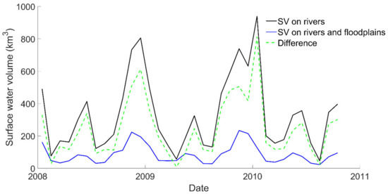 - Alsdorf, D.; Han, S.C.; Bates, P.; Melack, J. Seasonal water storage on the Amazon floodplain measured from satellites. Remote Sens. Environ. 2010, 114, 2448–2456. [Google Scholar] [CrossRef]