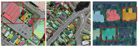 Visualization examples with classical instance segmentation model-Mask R-CNN. Note: the red boxes represent buildings with blurring contours, the yellow boxes represent undetected small buildings and the green boxes are generated by Mask R-CNN.