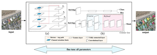 A contour loss [37] is introduced into the general mask regression loss in Mask R-CNN, which is additional supervision information to optimize the contour learning, minimize the deviation, and achieve more precise contours for building extraction. The overall training objective is the combination of the following four losses: