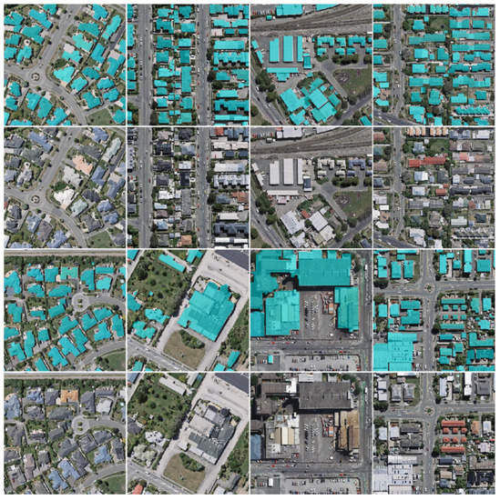 The WHU aerial image dataset is proposed by Ji et al. [3]. The dataset has a large variation in image characteristics, including different lighting and atmospheric, sensor qualities, scales and building architectures. Some samples are illustrated in Figure 5. The spatial resolution of the images is 0.3 m. The dataset covers approximately 450 km and more than 187,000 buildings with different sizes and appearances in Christchurch, New Zealand. Aerial images and corresponding ground truth images are provided in the dataset containing 8188 RGB images with 512 × 512 pixels. The dataset is divided into the training set with 4736 images, a validation set with 1036 images and a test set with 2416 images.