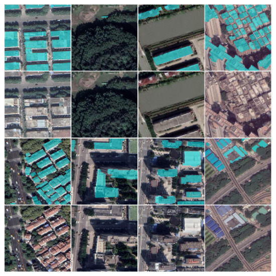 The self-annotated building instance dataset [39] images are acquired from Google Earth (Google Inc., Mountain View, CA, USA.) and are manually annotated. As shown in Figure 7, the dataset consists of 7260 tiles, and 63,886 building instances in four Chinese cities: Beijing, Shanghai, Shenzhen and Wuhan. Each image has a size of 500 × 500 pixels with a resolution of 0.29 m/pixel. The dataset contains a large number of non-orthophoto images. Some samples from the self-annotated building instance segmentation dataset are shown in Figure 8. A total of 7260 labeled images are split into 5985 images for training and 1275 for testing.