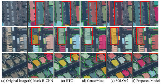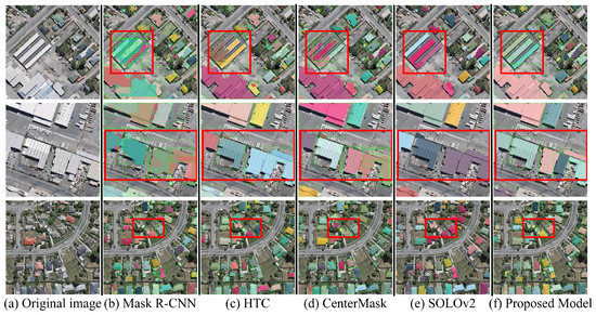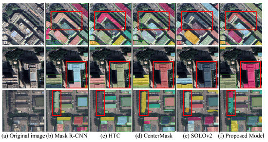 Visualized results of building instance extraction using the WHU aerial image dataset: (a) the original remote sensing imagery, (b) Mask R-CNN, (c) HTC, (d) CenterMask, (e) SOLOv2, (f) Proposed model.