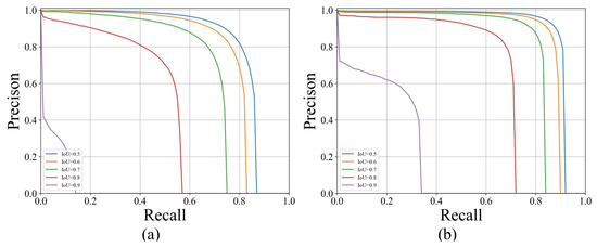 In this study, the standard MS COCO metrics [41] were employed for evaluating the task, including the mean average precision (), and mean average recall () over multiple intersection over union () values. is given in Equation (12) below: