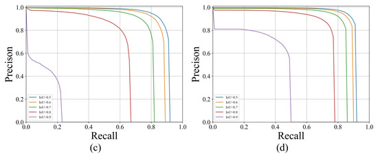 Precision-recall curve with different IoU thresholds: (a) Mask R-CNN, (b) Hybrid Task Cascade, (c) SOLOv2, (d) Proposed model.