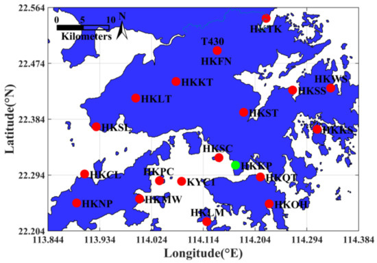 The GPS observation data of 19 ground-based receivers obtained from the SatRef in Hong Kong were selected during the tomographic period of the entire August of 2019. The top boundary of the tomographic region was calculated based on radiosonde water vapor profile data in August of each year from 2010 to 2018. The investigated tomographic area was therefore from 22.204° N to 22.564° N in latitude and from 113.844° E to 114.384° E in longitude, with a height range from 0 m to 10,560 m. The number of spatial voxels used for tomography was 6×4×13 with a horizontal resolution in the latitude and longitude directions of 0.090°, and the vertical resolution was set according to different stratification schemes. Figure 2 shows the geographical distribution of the GNSS receivers and the radiosonde in the tomographic area, in which the red points represent the locations of 19 GNSS receivers and the green point represents the location of the radiosonde.