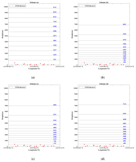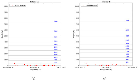The minimum height interval is an important parameter that directly affects the height of each voxel. If the value of the minimum height interval is adjusted by a long step length, the optimal value will be missed. Therefore, the vertical stratification strategy based on the ANES was divided into five different schemes with a step length of 25 m. Introducing the traditional uniform stratification scheme for comparison, six vertical stratification schemes were used for water vapor tomographic experiments to verify the feasibility of the adaptive non-uniform exponential stratification method. Among the six vertical stratification schemes mentioned above, scheme (a) equally divides the tomographic region into 13 stratifications in the vertical direction based on the traditional uniform stratification; in schemes (b) to (f), ANES with minimum height intervals of 350, 375, 400, 425 and 450 m, respectively, were adopted to divide the tomographic region into 13 stratifications unevenly. Figure 3 displays the vertical resolution of the six stratification schemes.