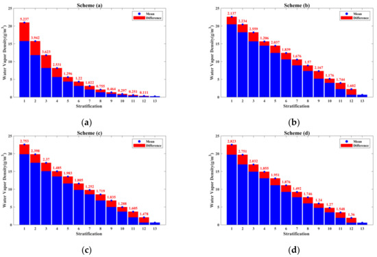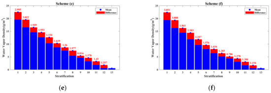 As shown in Figure 4, scheme (a) adopts the uniform stratification strategy, resulting in the phenomenon that the mean water vapor density of each stratification decreases exponentially with increasing stratification number. Meanwhile, the difference value of the mean water vapor density between two adjacent stratifications decreases with increasing stratification number. The maximum value of the differences was 5.237 g/m3 (between stratification 1 and stratification 2), and the minimum value of the differences was 0.111 g/m3 (between stratification 12 and stratification 13); the difference between the maximum and the minimum was 5.126 g/m3. In schemes (b) to (f), in which the vertical resolution was divided based on the ANES, the mean water vapor density of each stratification decreased linearly with increasing stratification, and the differences between the maximum and the minimum difference value derived from the six schemes were 1.383 g/m3, 1.501 g/m3, 1.583 g/m3, 2.206 g/m3, 2.302 g/m3, respectively. The above computations obtained from radiosonde data indicate that the traditional uniform stratification leads to a large difference in the difference value of the mean water vapor density between two adjacent stratifications, which is represented by a large difference in the difference value between bottom stratifications compared with a small difference between top stratifications, while the ANES can effectively avoid this problem.