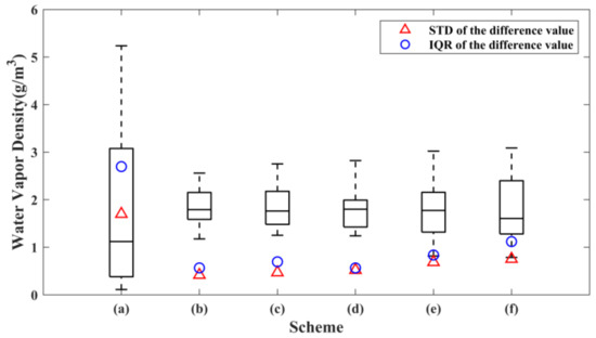 The box-plot as shown in Figure 5 also illustrates the advantages of the ANES, in which both standard deviation (STD) and interquartile range (IQR) are statistics used to characterize the dispersion degree of a combination of data. As shown in the figure, comparing the traditional uniform stratification and the ANES, the length of the box-plot of scheme (a) is larger than that of the other schemes, and the STD and the IQR values of scheme (a) are also much larger than those of the other five schemes, indicating that the ANES can significantly reduce the difference of the difference value between two adjacent stratifications. Furthermore, it can also be found in Figure 5 that scheme (f) has a relatively higher STD and IQR among the schemes based on the ANES approach. The reason for this phenomenon is that the minimum height interval of scheme (f) is larger than those of the rest of the ANES schemes, which leads to the more drastic change in the difference of the mean water vapor density between two adjacent stratifications. The same conclusion can be deduced from Figure 4. As shown in the figure, in schemes (b) through (e), only three values of the difference are greater than 2 g/m3, while in scheme (f), four values are greater than 2 g/m3, and two of them are greater than 3 g/m3.