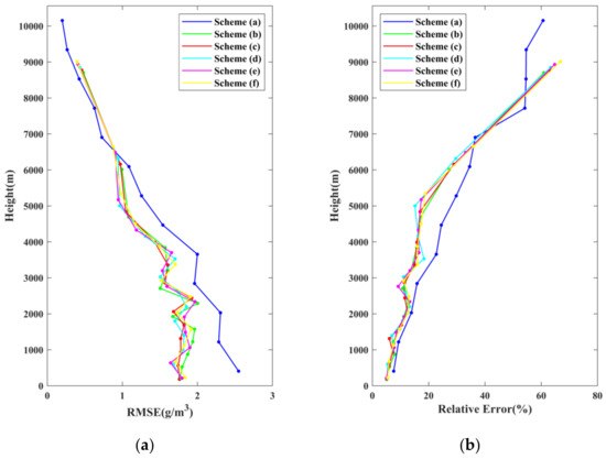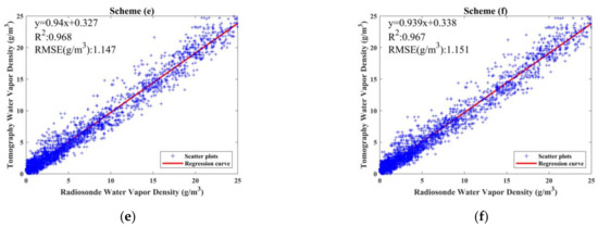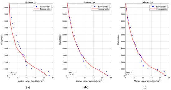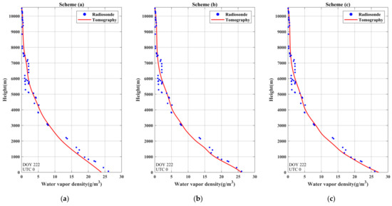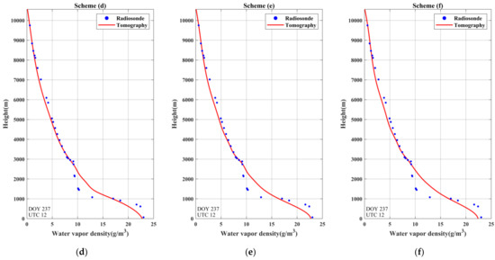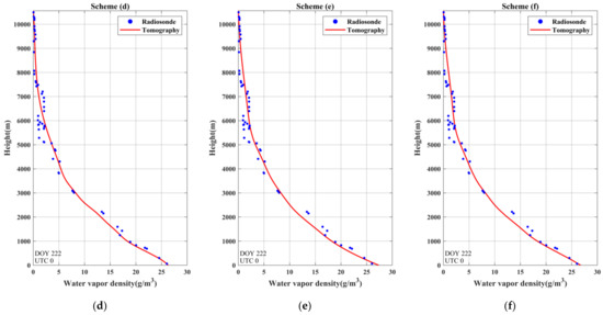 To further validate the performance of the proposed method, the tomographic results of scheme (b) to scheme (f) are compared with the tomographic results of scheme (a) in this section while radiosonde data are regarded as the references. Radiosonde data were often used as a reference to evaluate the quality of the water vapor density retrieved by other tomographic approaches [15,16,21]. The reliability of using radiosonde data as a reference has been verified, though the limitation of its low spatial resolution may cause errors in terms of water vapor [31,32,33]. Radiosonde data have the advantage of high vertical resolution, which can provide accurate vertical water vapor information at various altitudes, so the water vapor density derived from radiosonde data was used to validate the proposed approach in this paper.