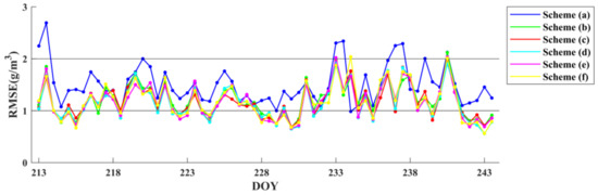 Time series of the RMSE of the tomographic reconstructions derived from the six schemes using radiosonde data as a reference for 31 days (DOY 213 to DOY 243).