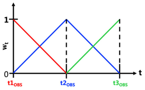 Temporal weighting coefficient for assimilation of radar observations. t1OBS, t2OBS, and t3OBS mark the observation time and the color shades are temporal weighting corresponding to the observation in the same color.