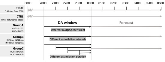 For the convenience of evaluating the impact of individual data assimilation parameters, an observing system simulation experiments (OSSEs) framework that assumes a “perfect model and perfect observation” is configured. Many previous studies have shown that OSSEs are a very helpful approach to understanding the behaviors and impacts of data assimilation methods and/or new observation data [17,47,48]. OSSEs include a natural run that mimics the real-world truth state (TRUE) and is used to extract observations, a baseline control forecast experiment (CTRL). Both were cold-started 20 h before the assimilation experiment (that is, 0000 UTC 27 June). Disturbances were artificially added during the start-up phase of CTRL to ensure sufficient difference from TRUE. The two have been integrated for 20 h to ensure the physical balance of the model and sufficient details of mesoscale and microscale clouds and hydrometeors. In addition, OSSEs contain three sets of sensitivity experiments, which are used to analyze the influence of relaxation coefficient , radar data update intervals, and continuous assimilation duration. The three sets of experiments use the forecast of CTRL as the experimental background field, and use TRUE as the real observation for assimilation. The time schedule of the three experimental groups is illustrated in Figure 3, and more details of the experimental design are described in Table 2.
