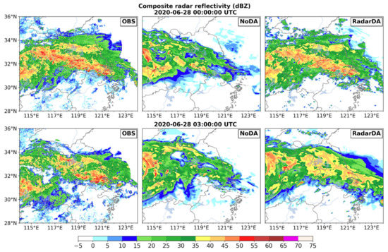 Composite radar reflectivity (units: dBZ) of multiple radar observations (OBS), model forecasts without DA (NoDA) and with radar DA (RadarDA) at 0000 and 0300 UTC 28 June 2020.