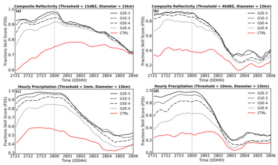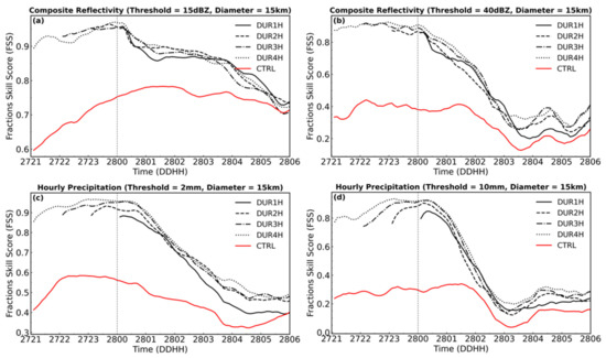 Time series of forecast skill scores (FSS) of composite reflectivity with thresholds of 15 dBZ (a) and 40 dBZ (b), and FSS for hourly accumulated precipitation with thresholds of 2 mm (c), 10 mm (d) of Group B. The horizontal scale (diameter) used for FSS is 15-km.