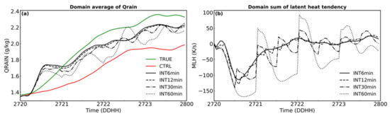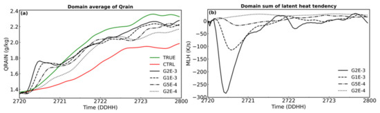 Time series of domain-averaged Qrain (a) and domain-integrated latent heat tendency terms (b) of Group B.