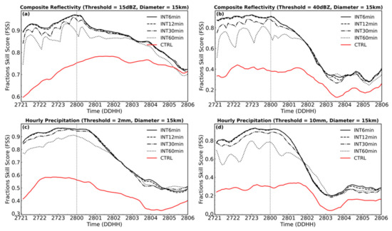 Time series of forecast skill scores (FSS) of composite reflectivity with thresholds of 15 dBZ (a) and 40 dBZ (b), and FSS for hourly accumulated precipitation with thresholds of 2 mm (c), 10 mm (d) of Group C. The horizontal scale (diameter) used for FSS is 15-km.