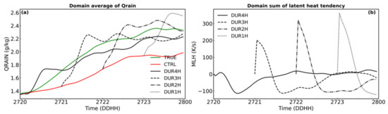 Time series of domain-averaged Qrain (a) and domain-integrated latent heat tendency terms (b) of Group A.