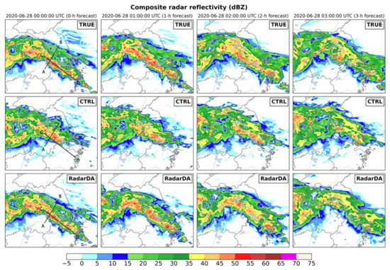 Composite reflectivity (units: dBZ) at 0000–0300 UTC 28 June 2020. 1st row for simulated observations TRUE; 2nd row for control forecast CTRL; 3rd for radar assimilation forecast RadarDA. Thick solid lines in the panels of 0000 UTC (A–B, C–D) denote the location of cross section in Figure 12.