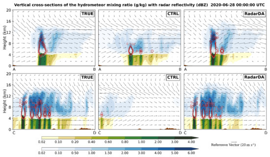 Cross-section C–D passes through the center of the convective precipitation rainband. It can be seen that the hydrometeor distribution of the convection in the truth run was reproduced precisely by HLHN RadarDA, including the locations, morphology and magnitudes of all precipitate particle categories. The impact of HLHN on the wind field is also evident. The RadarDA resulted in more accurate winds and stronger updrafts in the convection clouds. The inflow, outflow, and ascending and descending airflows associated with all convective cells were also well improved from CTRL.