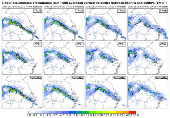 1-h accumulated total precipitation (shading; units: mm) overlaid with the averaged vertical velocities between 850 hPa and 500 hPa (black contour; units: 1 m/s) at 0000–0300 UTC 28 June 2020. 1st row for simulated observations TRUE; 2nd row for control forecast CTRL; 3rd for radar assimilation forecast RadarDA.