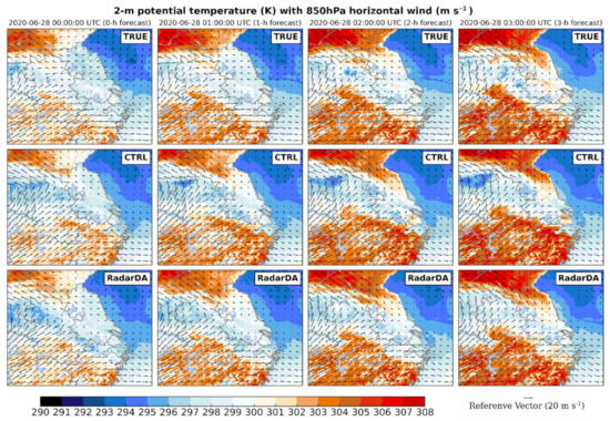 2-m potential temperature (shading; units: K) overlaid with 850 hPa horizontal wind (wind arrows; units: m/s) at 0000–0300 UTC 28 June 2020. 1st row for simulated observations TRUE; 2nd row for control forecast CTRL; 3rd for radar assimilation forecast RadarDA.
